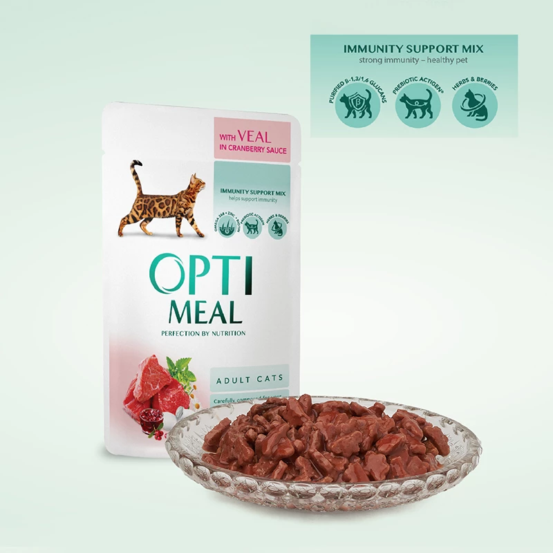 OPTIMEAL Cat Adult & Senior Veal & Cranberry in Gravy er et komplett våtfôr for voksne katter av alle raser.